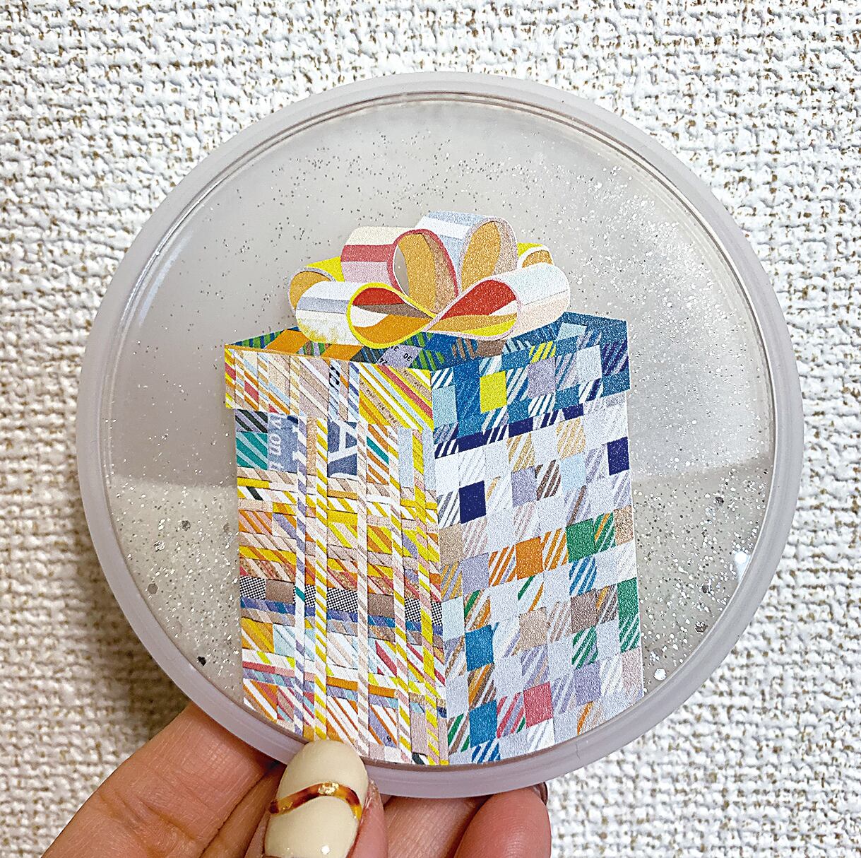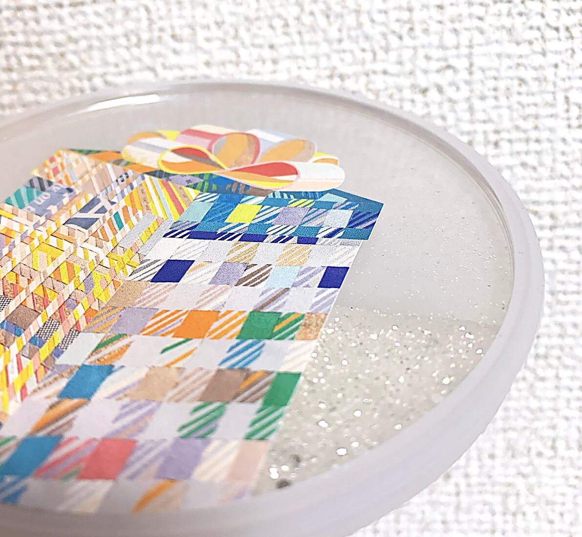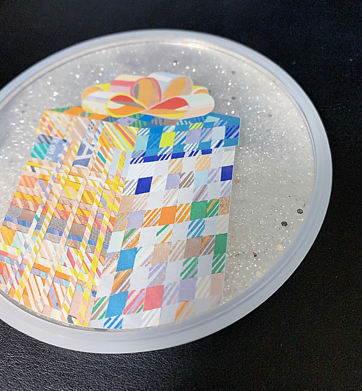 チェック柄のプレゼントボックスをコラージュして、コースターにプリントしました。